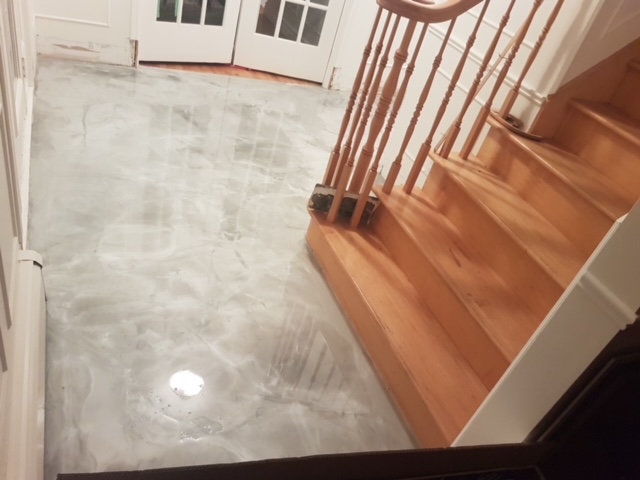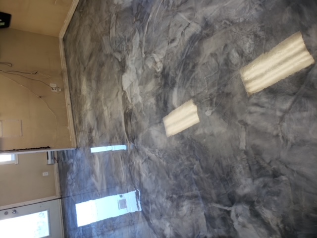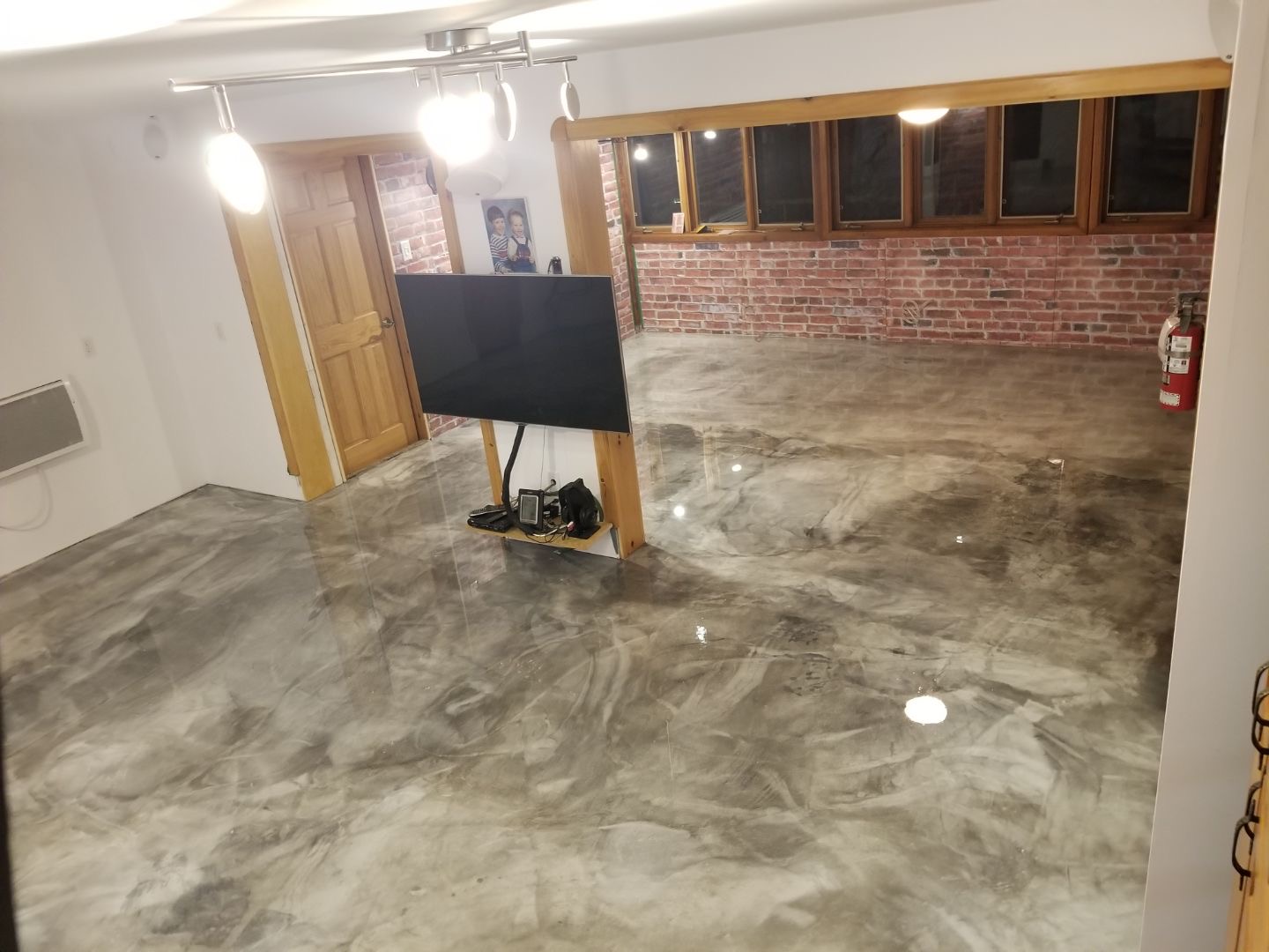 Le revêtement de sol en époxy métallique est un système de qualité industrielle à trois couches qui consiste en une couche d'apprêt époxy de couleur solide, une couche d'époxy métallique et une couche de finition en uréthane au fini brillant, satiné ou mat.